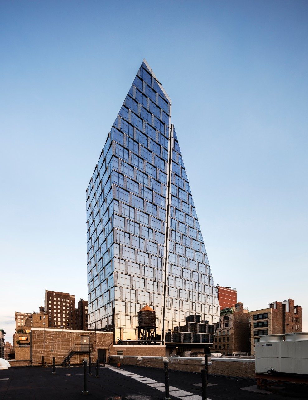 347-Fuß, 170.000 Quadratfuß Gebäude mit gemischter Nutzung in Manhattan. Die unteren sechs Stockwerke bieten Klassenzimmer und einen halben Platz Fitnessraum für eine private High-School und Luxus-Residenzen besetzen die oberen Etagen. Die Geometrie der Turmfassade verwendet eine ausgeklügelte einheitliche Vorhangfassade, die in Europa mit SunGuard® Neutral 41/33 Hochleistungsglas gefertigt wird, um dem Gebäude zu helfen, die LEED® Silber-Zertifizierung zu erreichen.