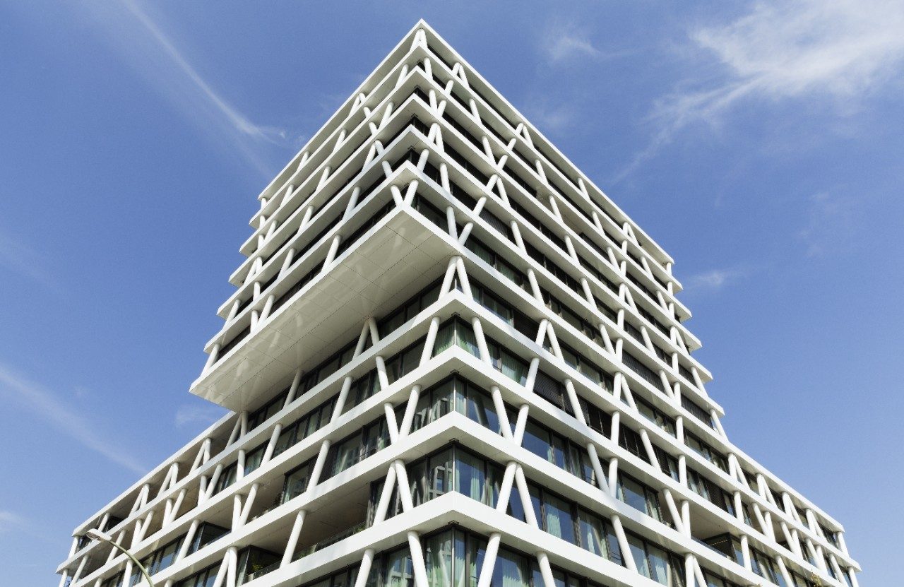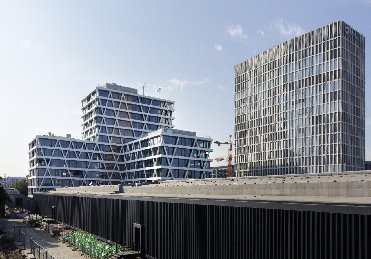 Architecturally, the building presents itself as an overlay of three different structures: horizontal storeys, an external net-like structure and the inner orange cores. Each floor offers several balconies as outdoor areas that can be used as workspaces or for rest and relaxation. The external support structure is made from white steel composite columns that enable column-free interiors along the glass façade and thus flexible interior use. At night, individual support segments of the external structure are illuminated, creating dynamic lines that are reminiscent of sine curves.
