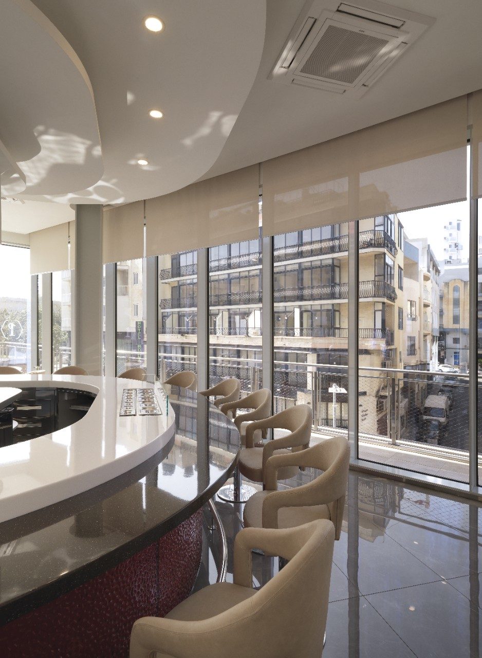 Located adjacent to Portomaso Business Tower 1, Malta’s tallest skyscraper, is a new development that was formerly occupied by the Portomaso Café, a single storey steel frame structure. With the appearance of a crystal ship with sails, the building has a non-sway steel frame structure that uses castellated beams to reduce the floor area.