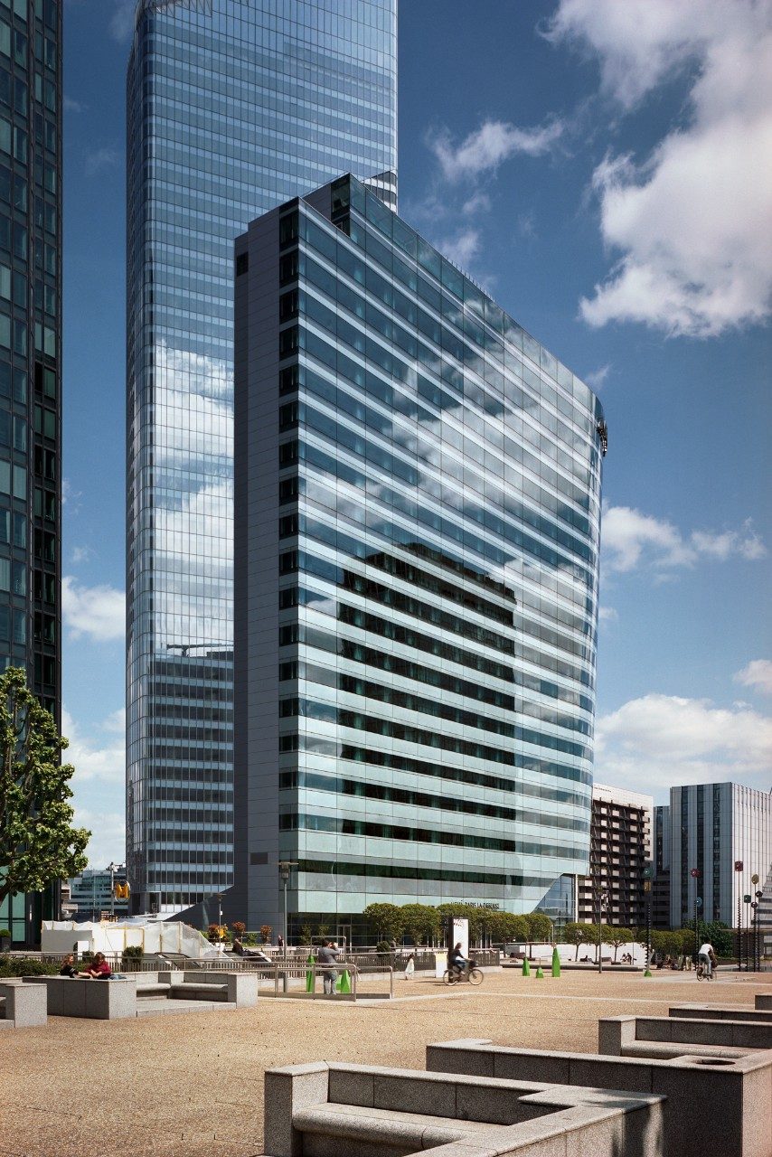 El edificio tiene una marcada identidad arquitectónica y un aspecto moderno. Sus dimensiones y forma permiten distinguir el hotel de las torres de oficinas que lo rodean. El edificio con forma de hoja de cuchillo juega con materiales en contraste: vidrio en la fachada del lado sur de la explanada y paneles metálicos granallados en el lado del bulevar. La fluida fachada curvada del sur termina en una proa con un borde inclinado que se proyecta hacia París. La enorme fachada de vidrio es visible desde todas las habitaciones, en las que las ventanas se extienden a lo largo de toda la anchura para abrirse hacia la fachada, lo que proporciona a los interiores una impresionante luminosidad y unas vistas espectaculares del perfil urbano.