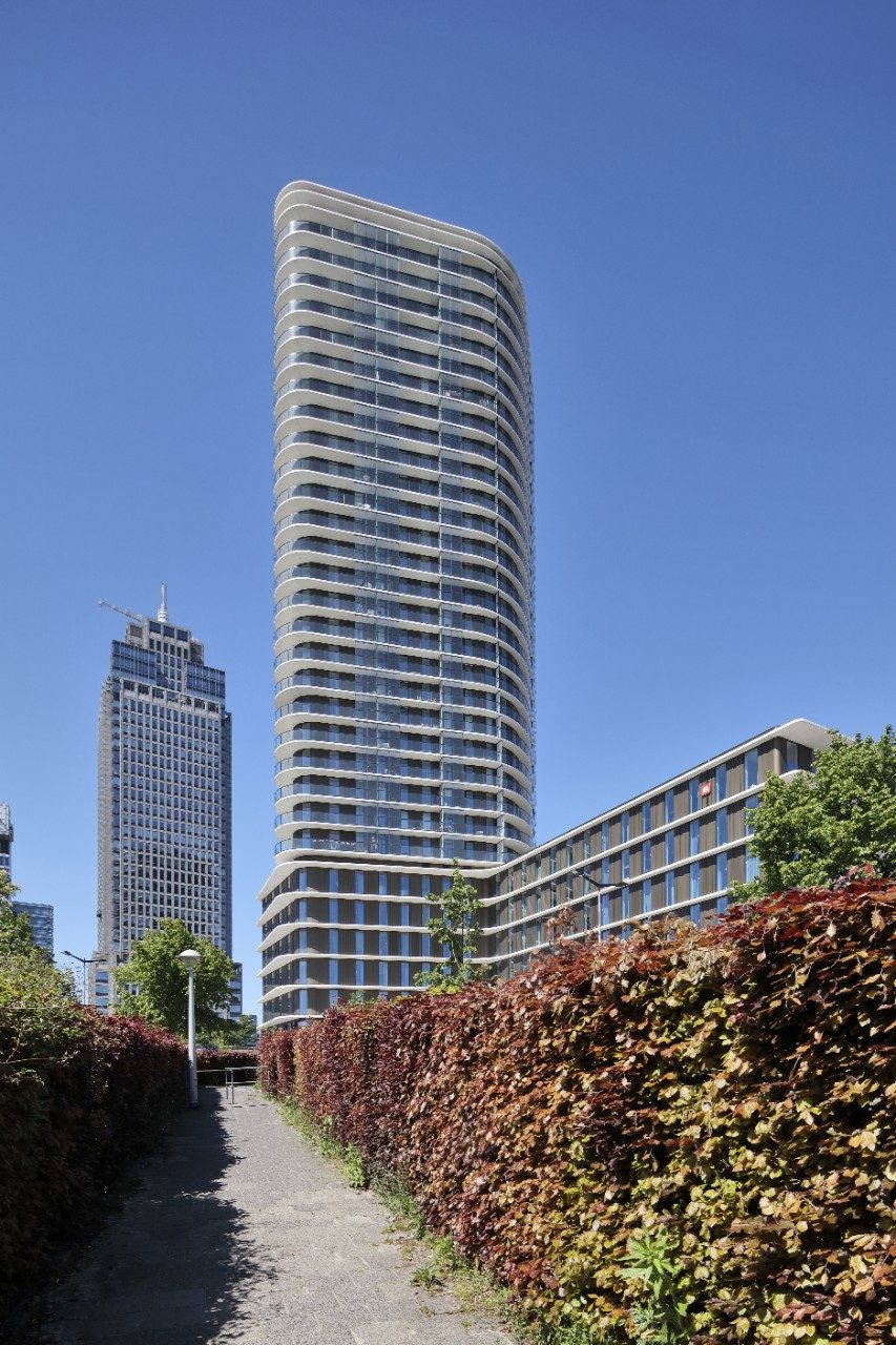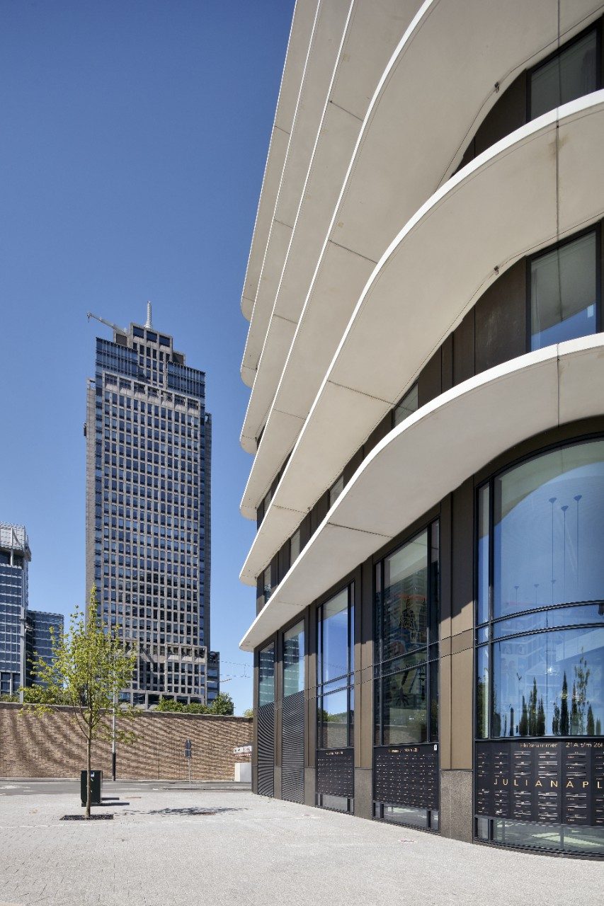 Ispirandosi alla cupola arrotondata della stazione Amstel, le linee iconiche della torre esaltano lo skyline di Amsterdam. La tettoia della torre offre spazio all'aperto, ombra da sole e protezione dai rumori per gli appartamenti. Le linee degli elementi verticali nella facciata in vetro sono attentamente sincronizzate con le linee della facciata della sala principale della stazione ferroviaria.