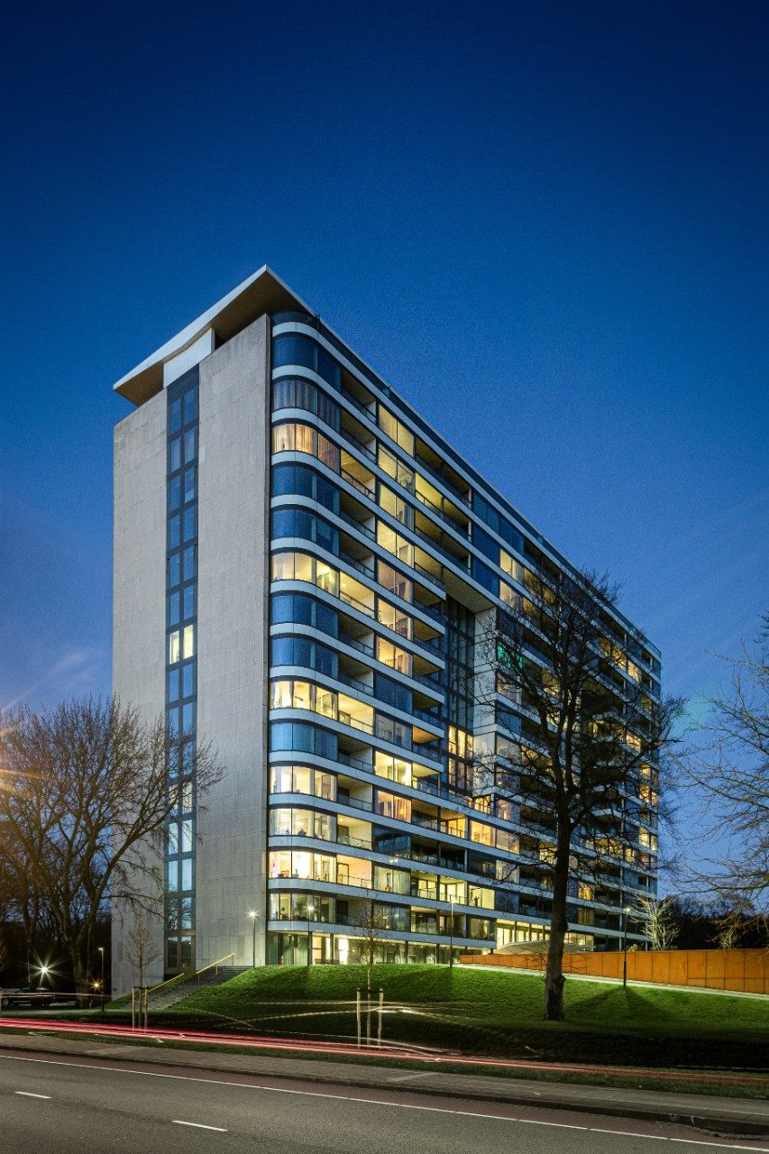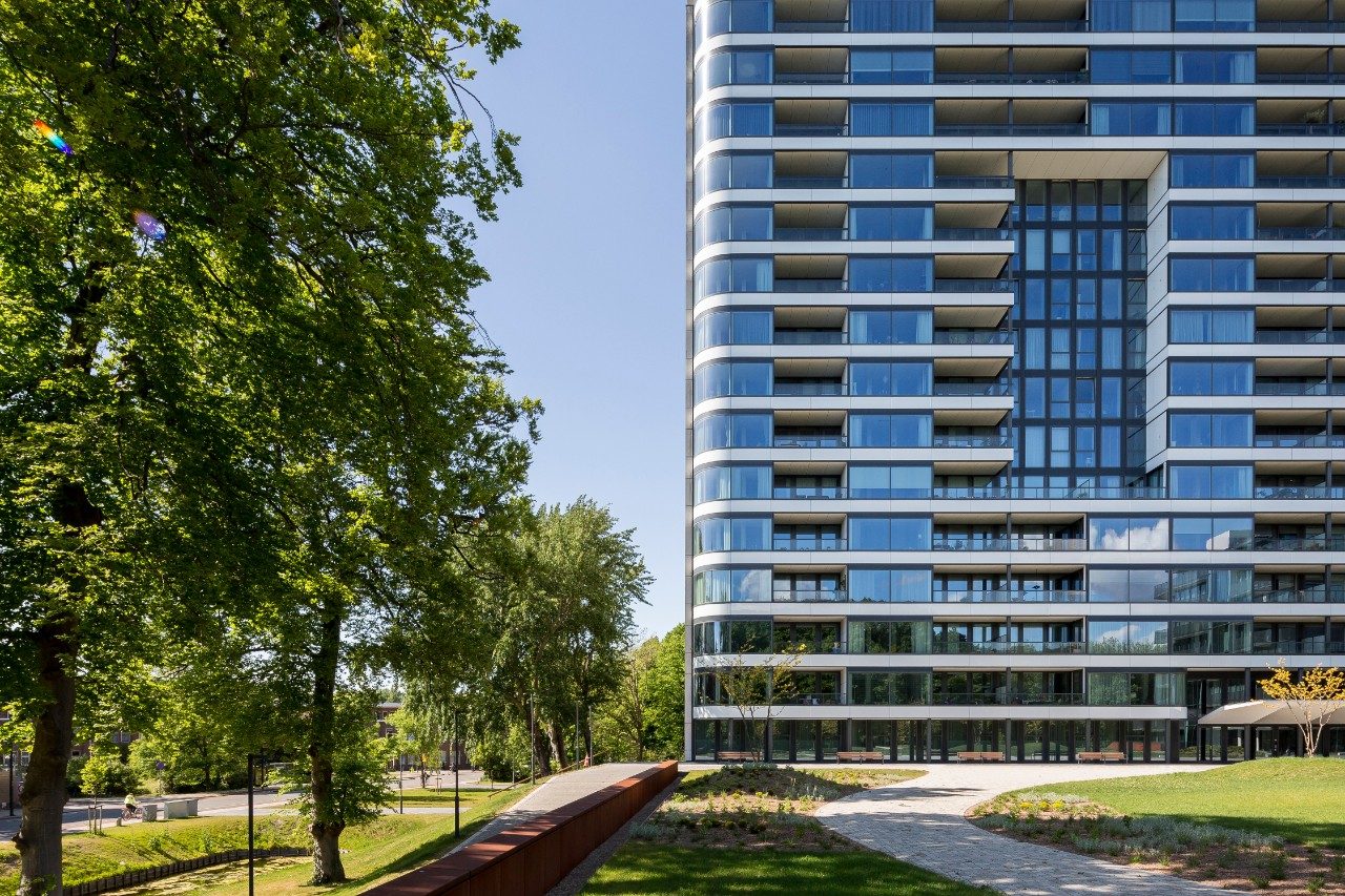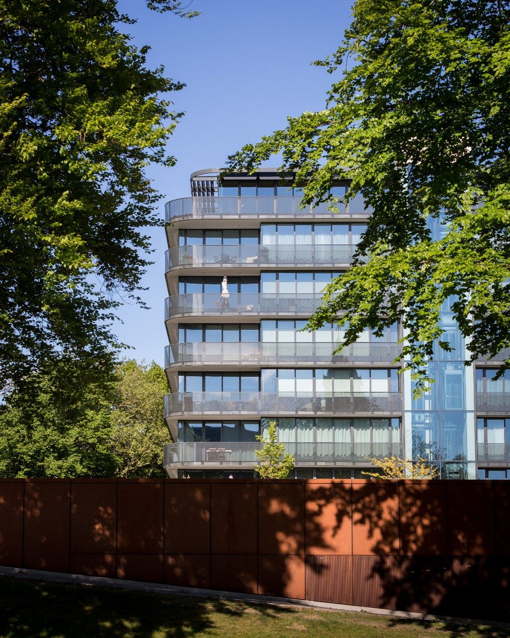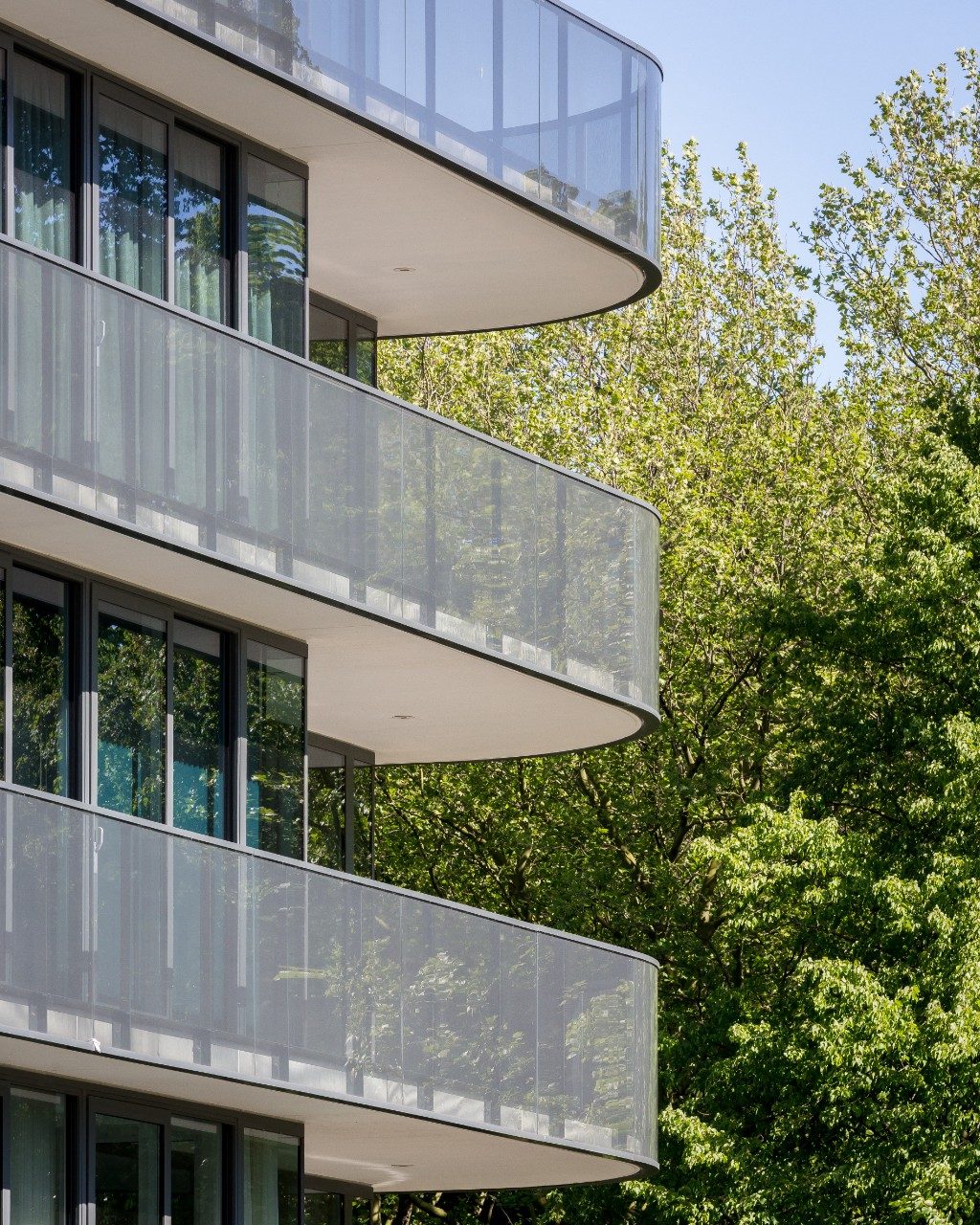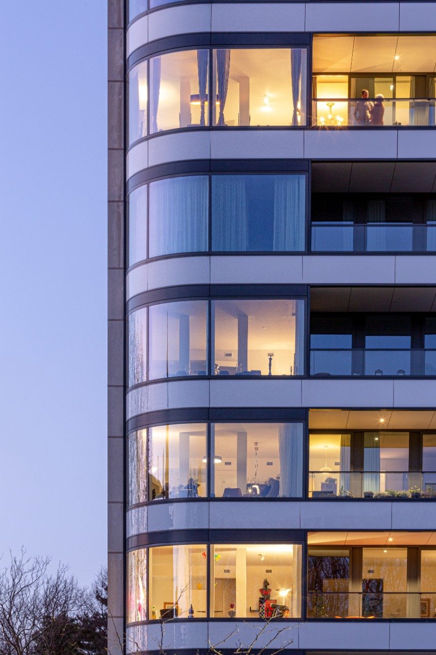 Una parte fondamentale del processo di riqualificazione sono le alte strisce di vetro e le strisce di vetro antisfondamento smaltato bianco, che rispettano il carattere modernista dell'edificio esistente, ma allo stesso tempo conferiscono al nuovo edificio residenziale un aspetto accattivante.