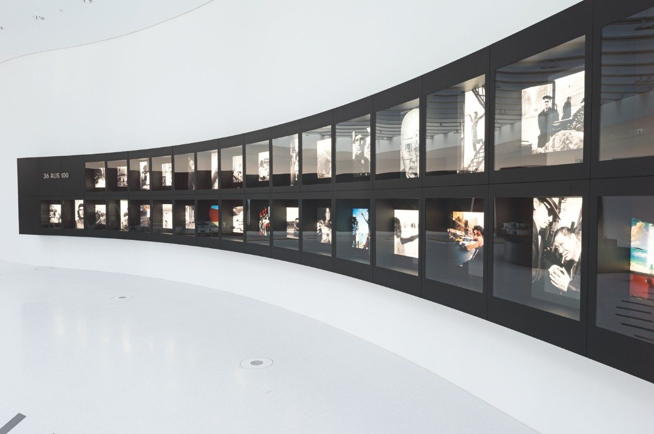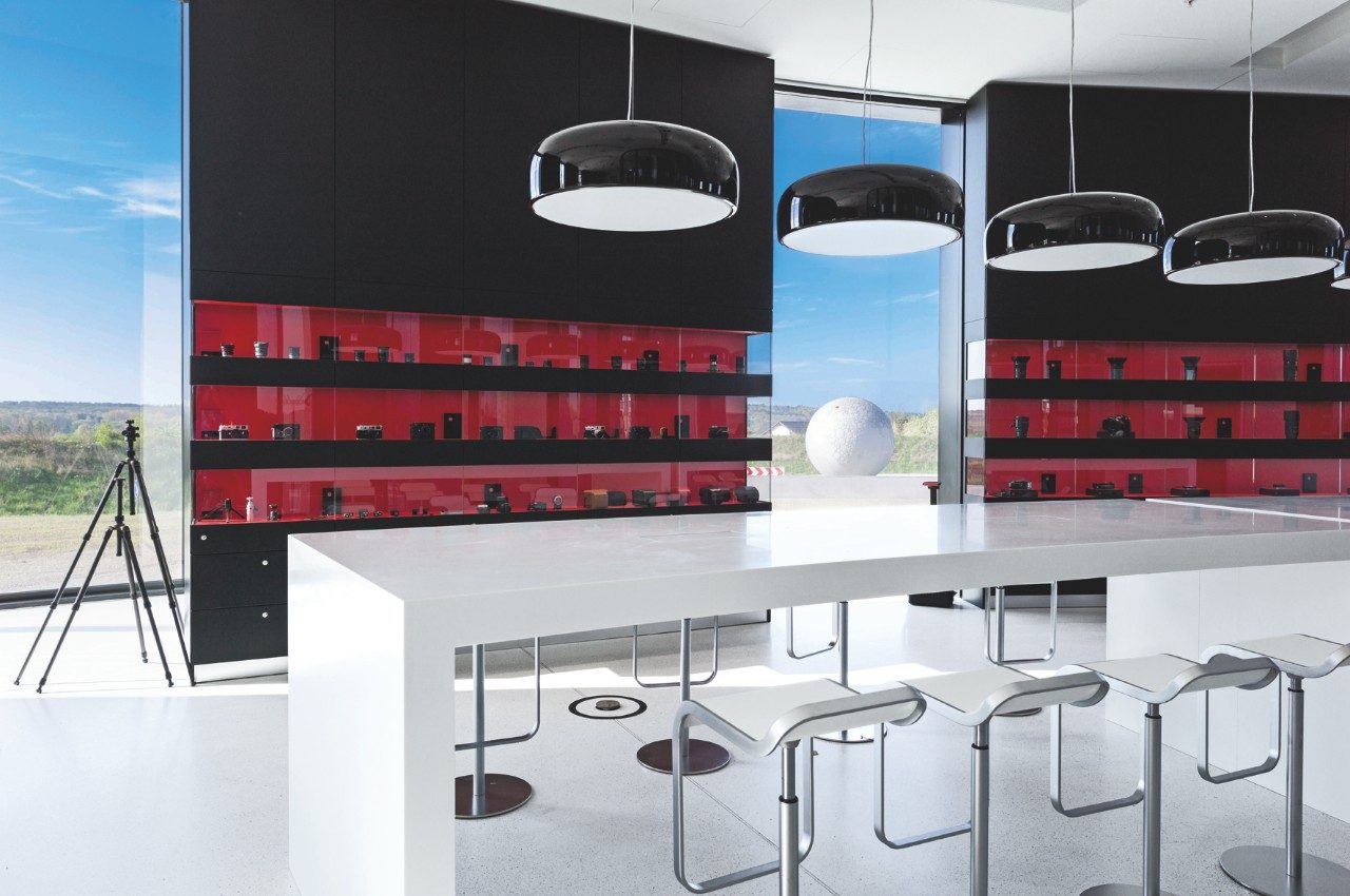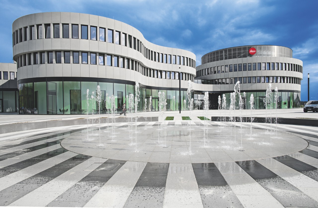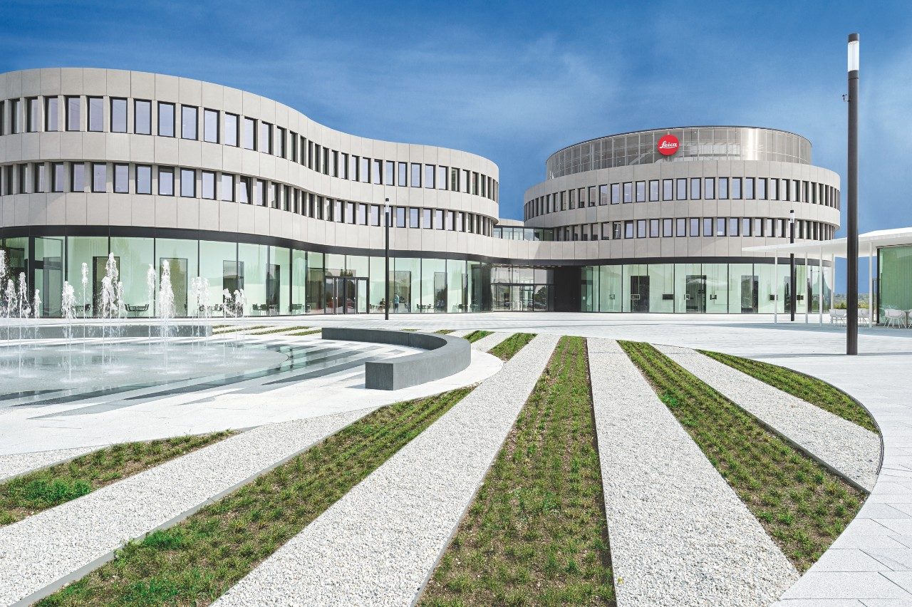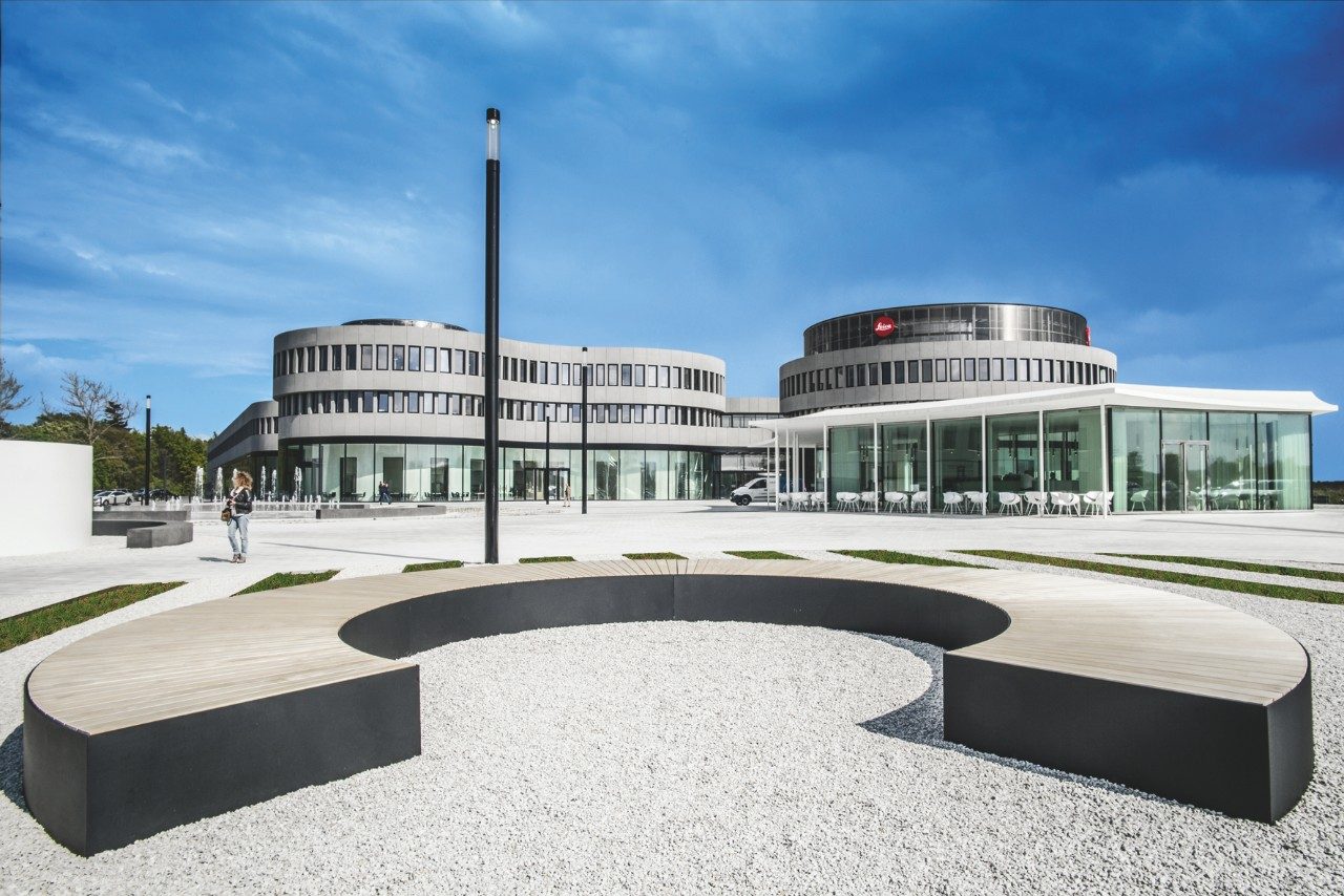 Zakrzywiona fasada siedziby mocno przypomina zestaw obiektywów aparatu. Dwie walcowate struktury tworzą główne wejście do budynku – okrągłe segmenty powtarzają się również w środku, dając automatyczne skojarzenie z soczewkami i pierścieniami Leica.