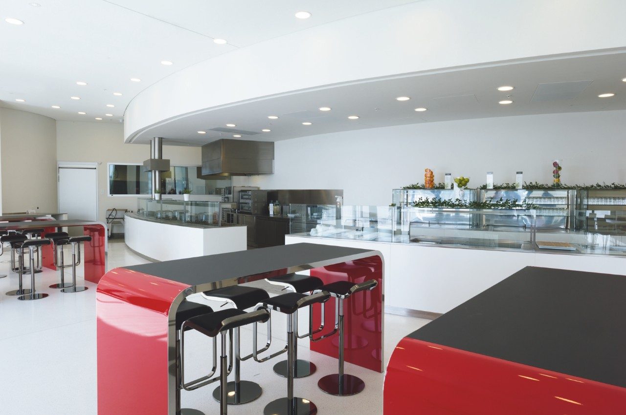 Na parterze częściowo zakrzywiona szklana elewacja o wysokości około 5 metrów, biegnąca wzdłuż całej konstrukcji, oferuje przechodniom widok w głąb budynku.