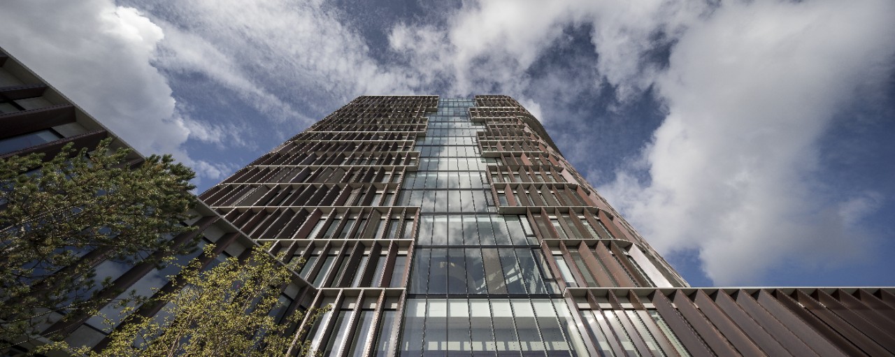A visibilidade e transparência são sublinhadas pela utilização de grandes painéis de vidro verticais nas persianas da fachada. A fachada está dividida numa estrutura de rede de relevo que inclui 3300 persianas revestidas a cobre, que funcionam como escudos climáticos amovíveis, abrindo ou fechando automaticamente em resposta à luz solar direta, garantindo que o ganho de calor direto nos laboratórios é mantido ao mínimo. As persianas protegem principalmente contra a luz solar direta, mas também permitem que a luz do dia seja filtrada através das suas finas perfurações em rede.