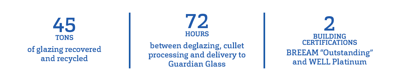 Guardian Glass collaborated with Structura, Cfield Construction and May Glass Recycling to recover and recycle 45 tons of glazing from Mountbatten House. Within 72 hours after the first glazing unit being expertly extracted by Structura the glass was transported to May Glass Recycling’s facility, where it was cleaned, crushed and sorted into cullet. This cullet was then delivered to the Guardian Glass plant in Goole, Yorkshire, UK, then melted and transformed, with the addition of other virgin raw material in the furnace, into new float glass.