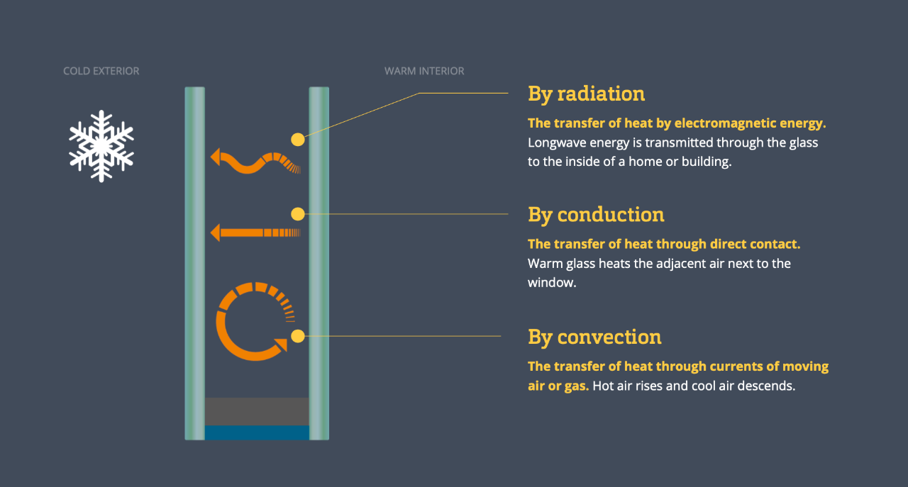 Thermal transfer through an IGU takes place via three mechanisms: